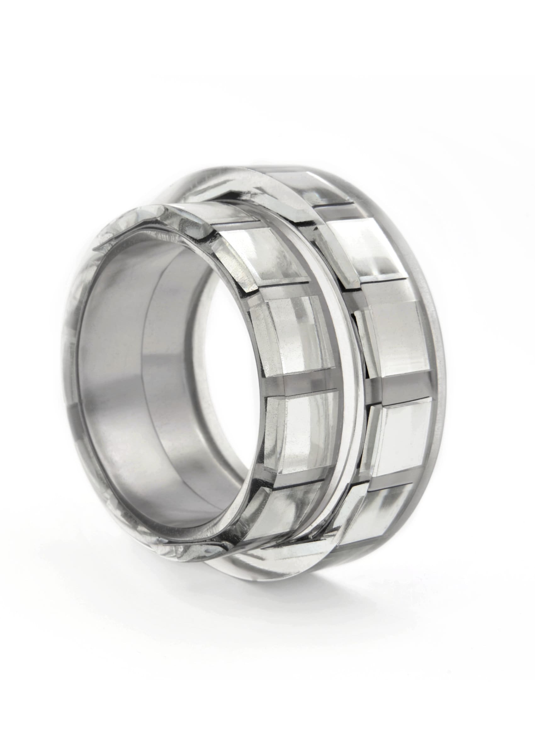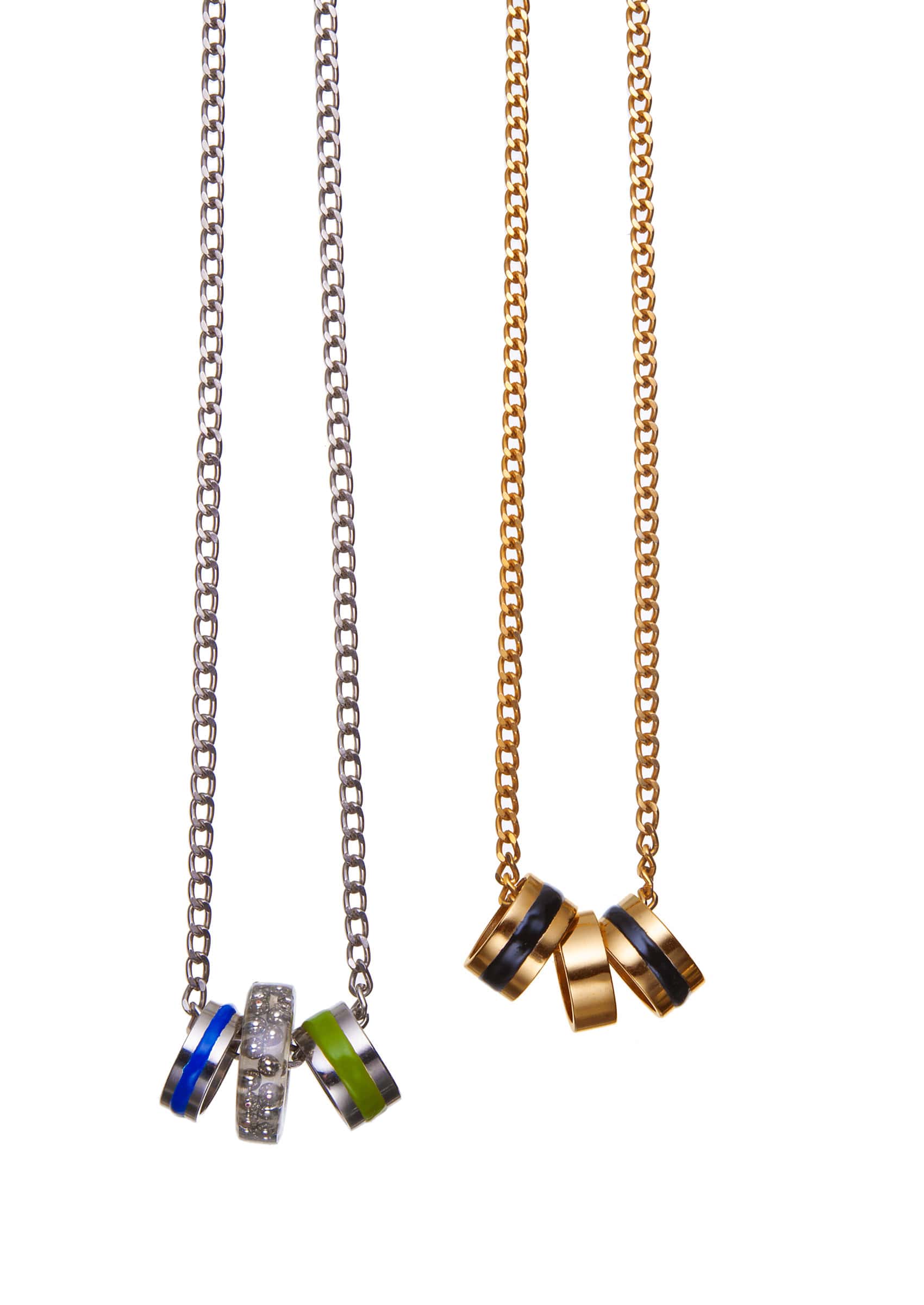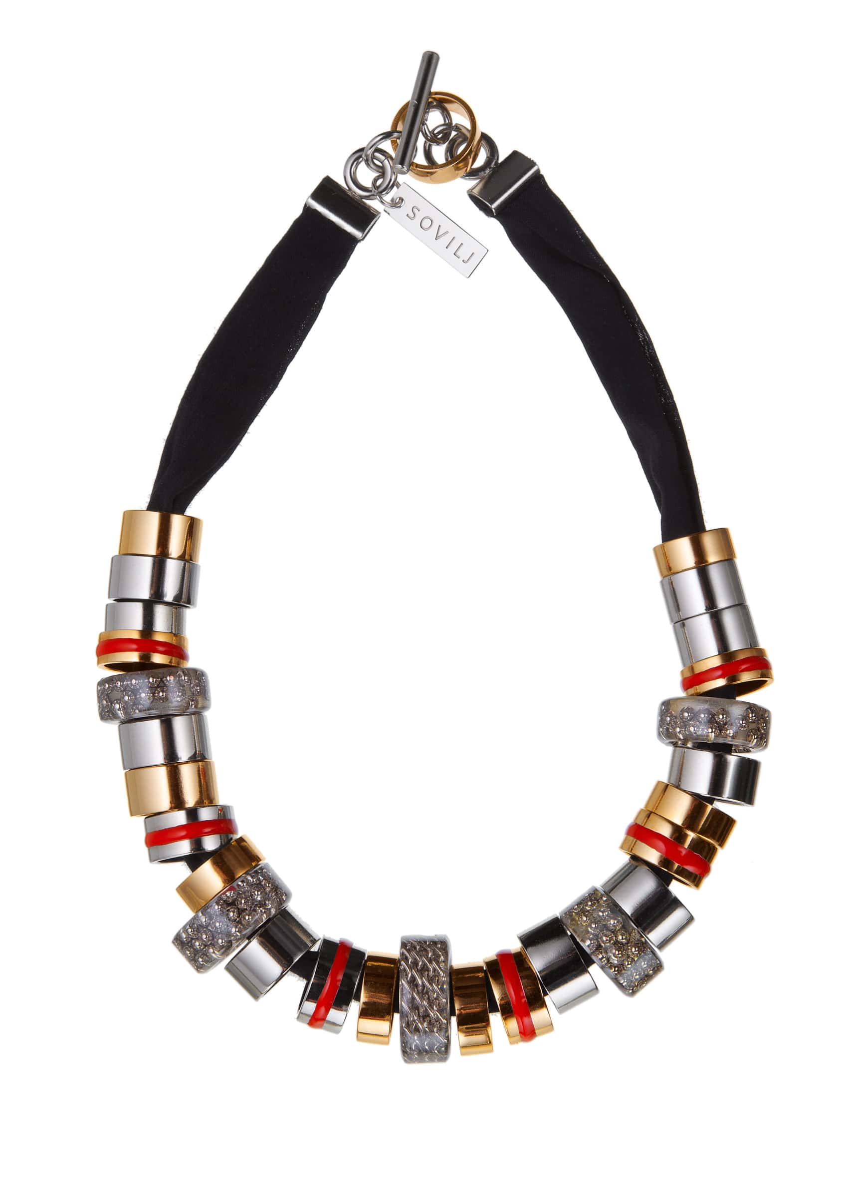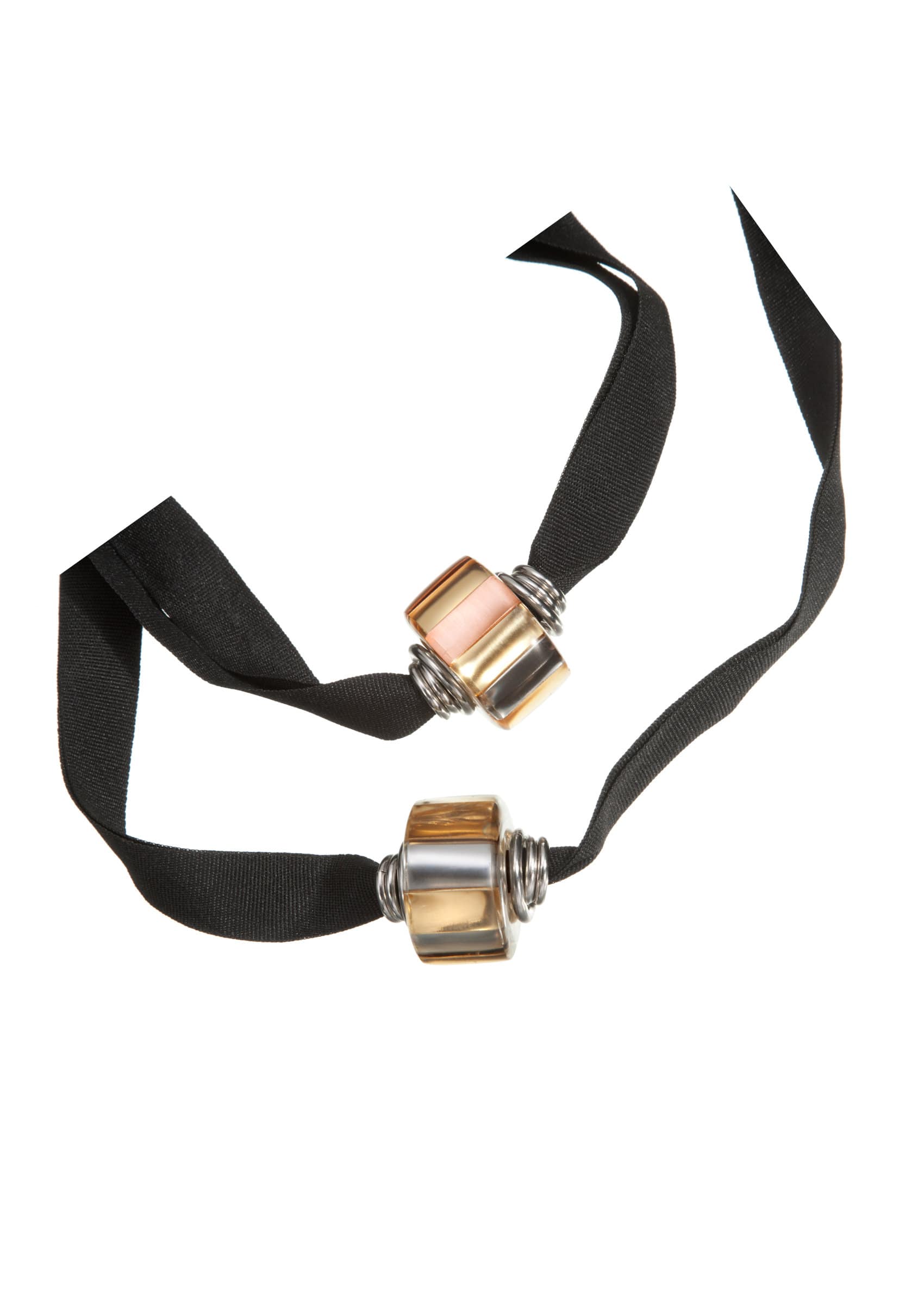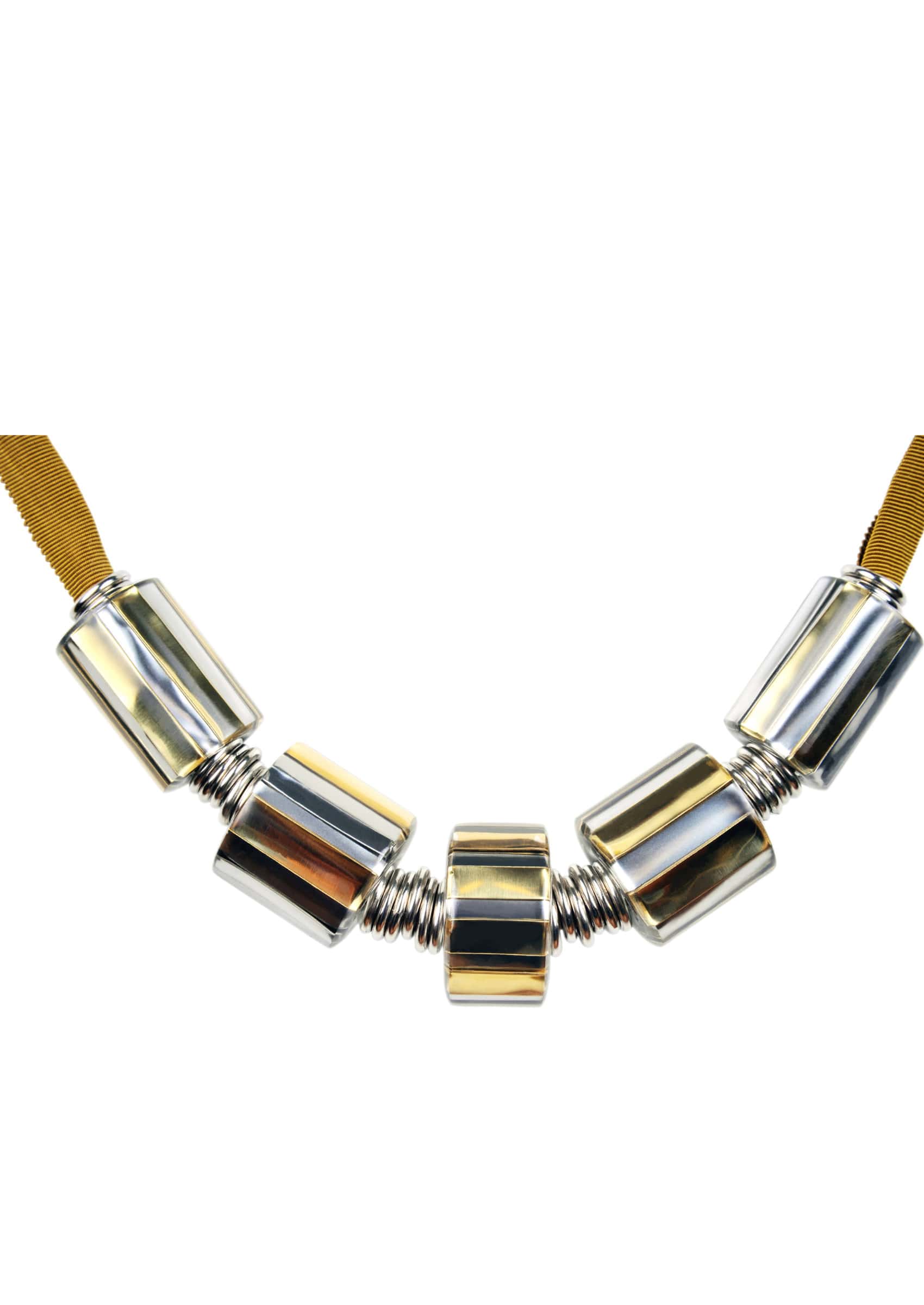 Inspired by the wheel, the key object in the evolution of our civilisation, this collection is all about statement necklaces. Different sizes of cylinders, as one of the most basic curvi-linear geometric shapes, in combination with metals like stainless steel and brass trapped in resin, create opulent and sculptural forms of jewellery.