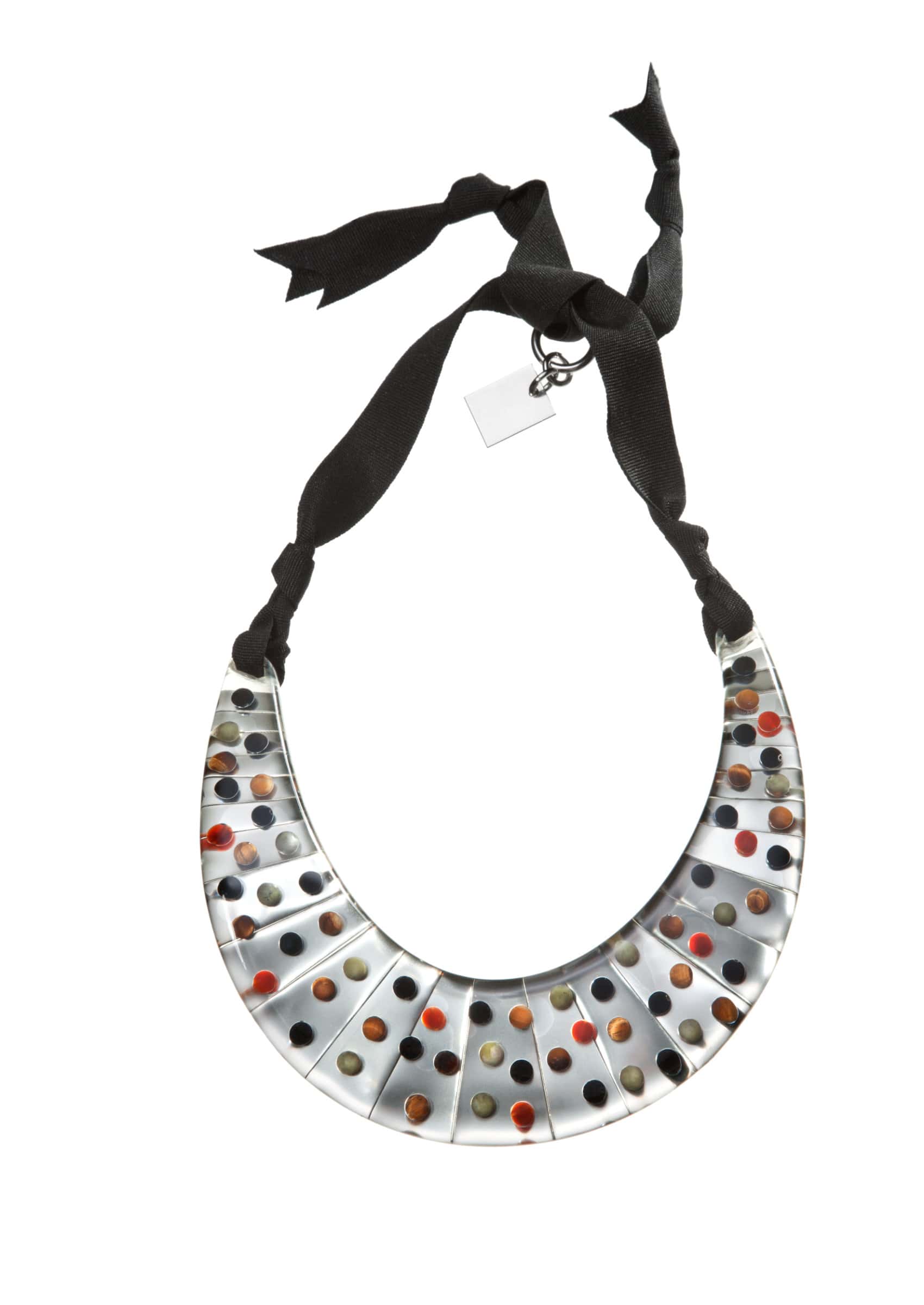 Necklaces made of resin in one piece, that ergonomically fit female neck, are handmade in a long process of moulding. The inspiration was drown from the ancient emblem used to ward off evil spirits, which is believed to bring good luck if nailed with the ends pointing up. There are theories that the magic of this symbol lies in its shape - that of the horned moon.