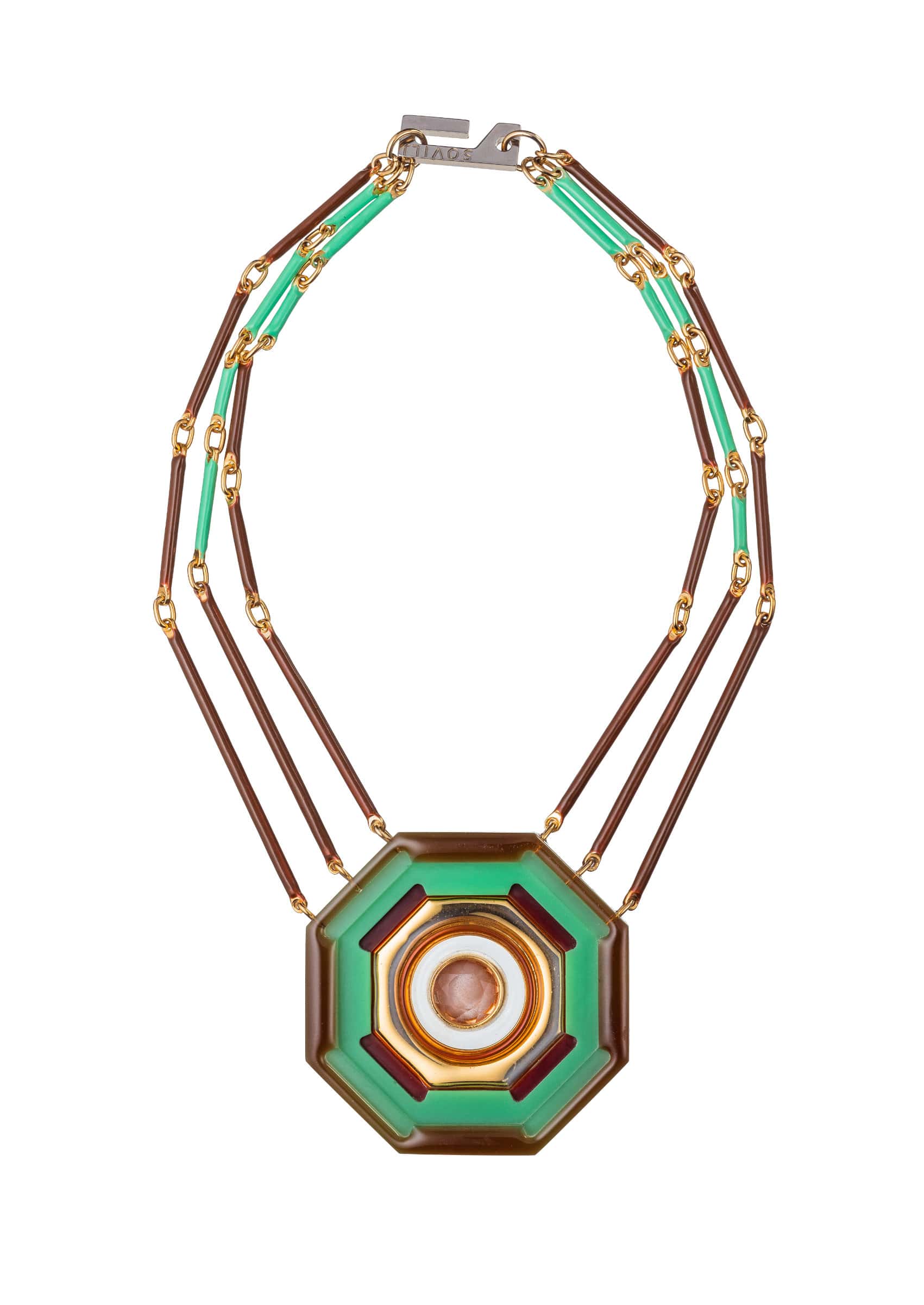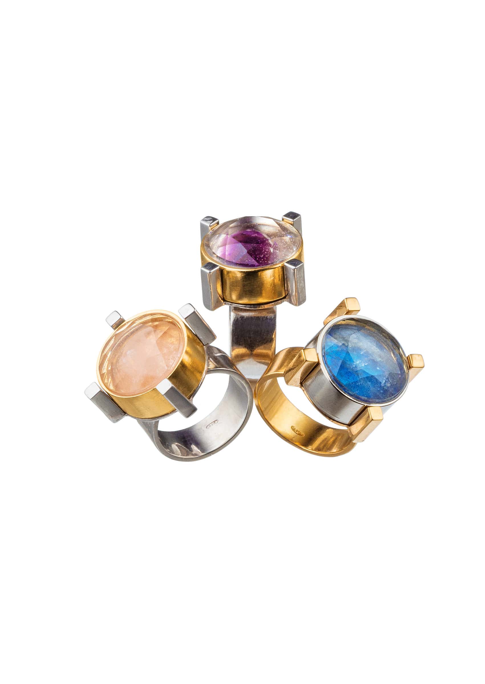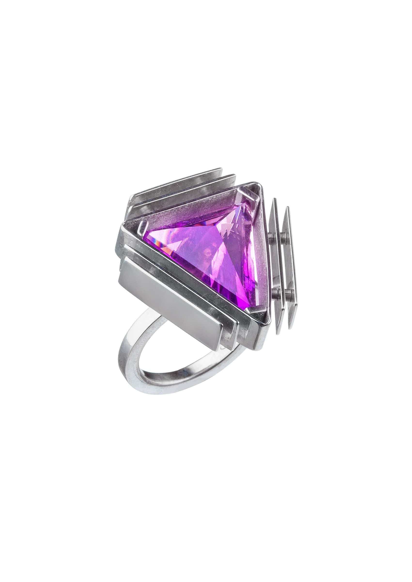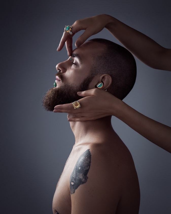 Like an alchemist in a game, he created strong geometric, sculptural pieces of jewelry that contain hidden symbols within.