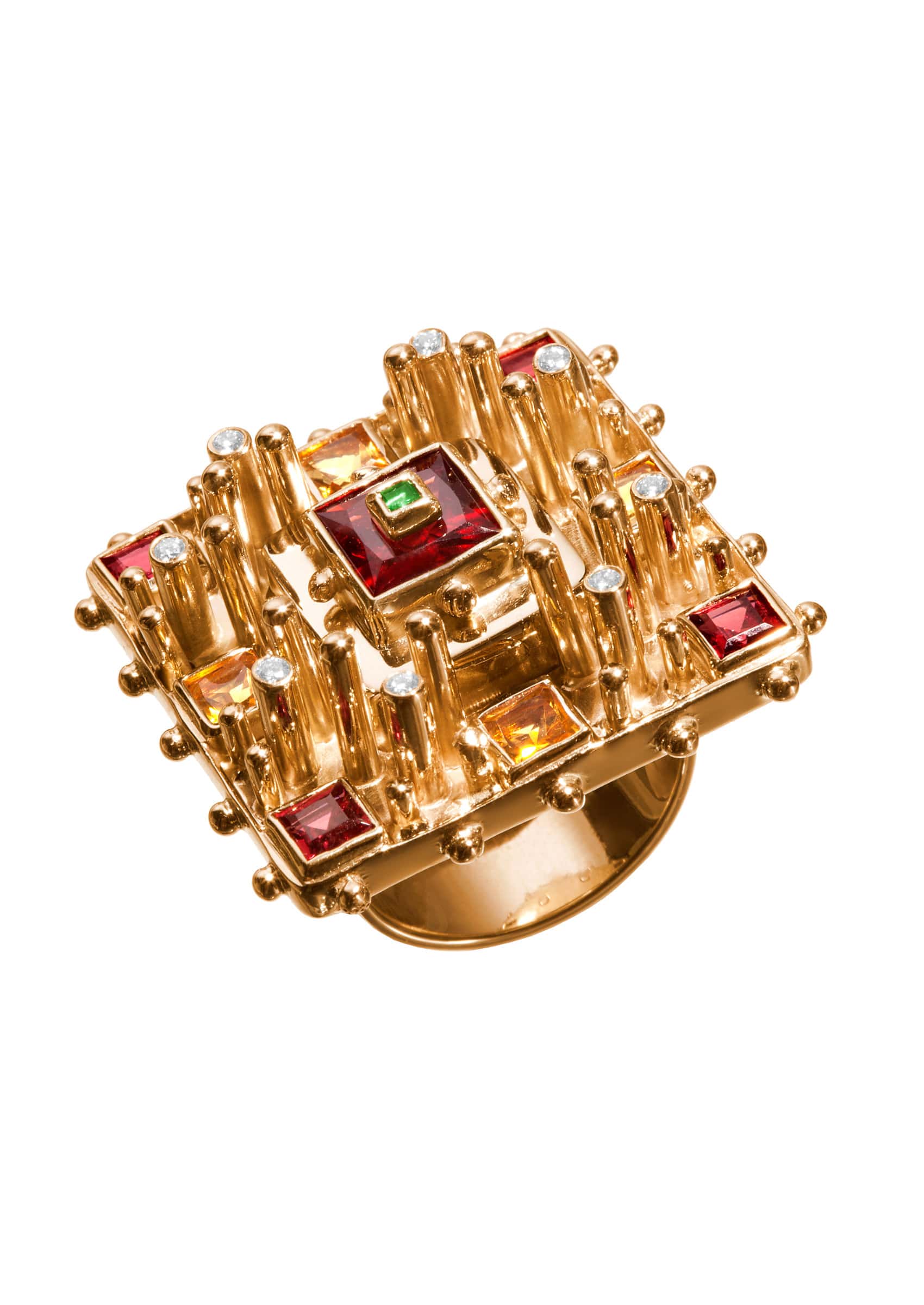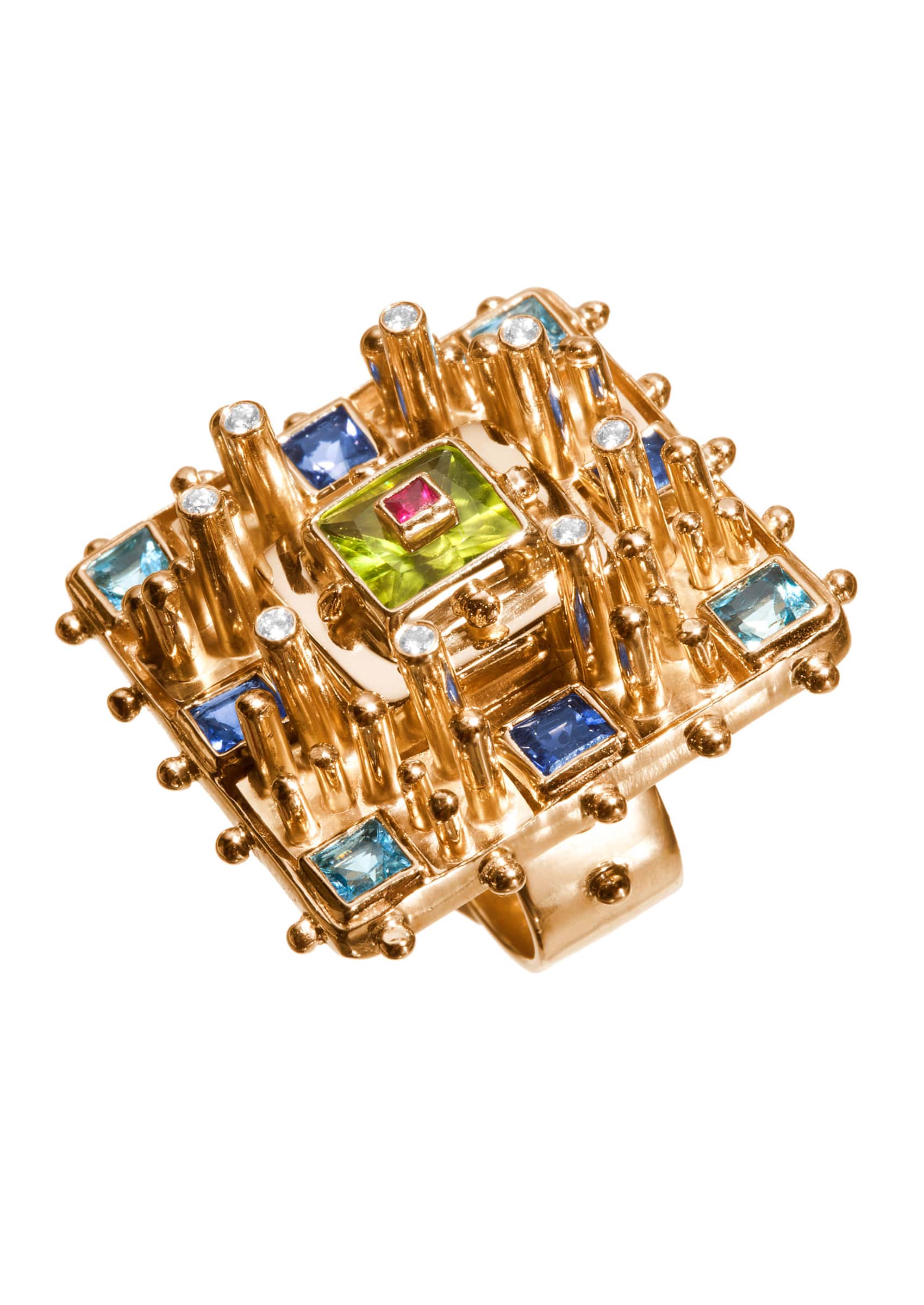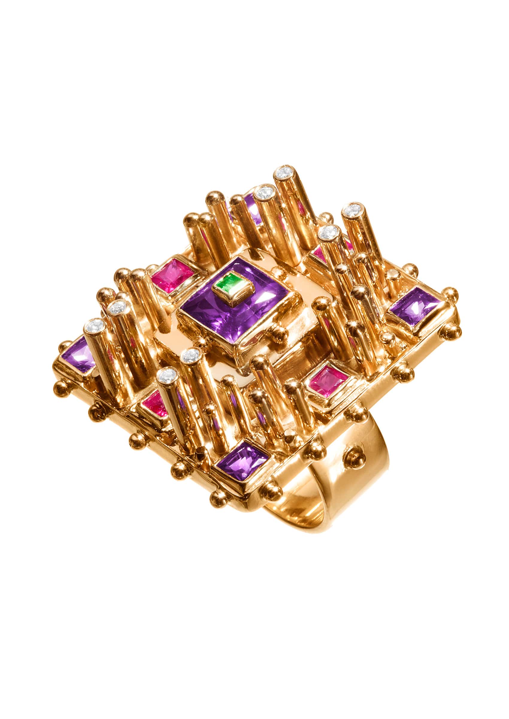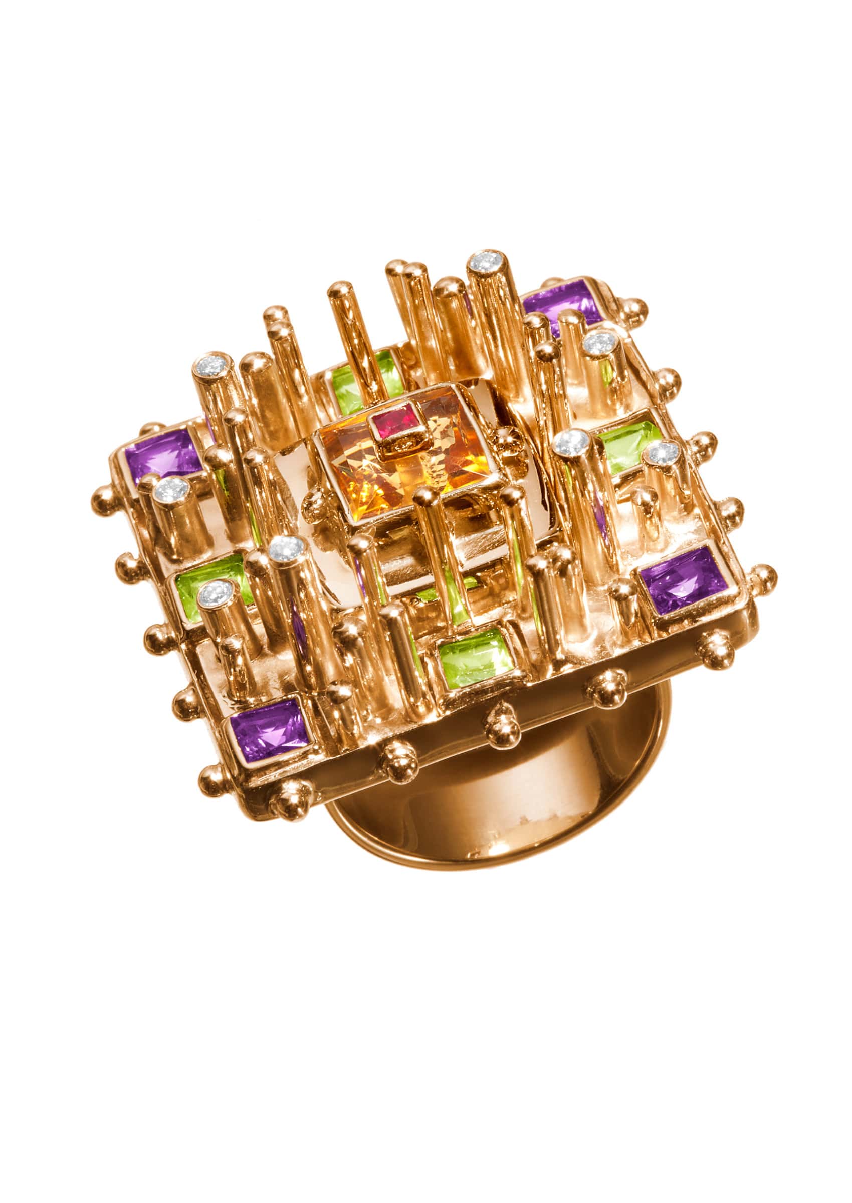 Collection of 5 limited edition cocktail rings, significantly called New York, was carefully handcrafted in gold, precious stones and diamonds, designed to glorify geometry, the City and Art Deco Style. The collection was designed to celebrate 5 years of the Sovilj brand and it was presented on a gala exhibition held on 8 June 2010 in the in Sculpture Park of the Croatian Academy Glyptotheque in Zagreb.